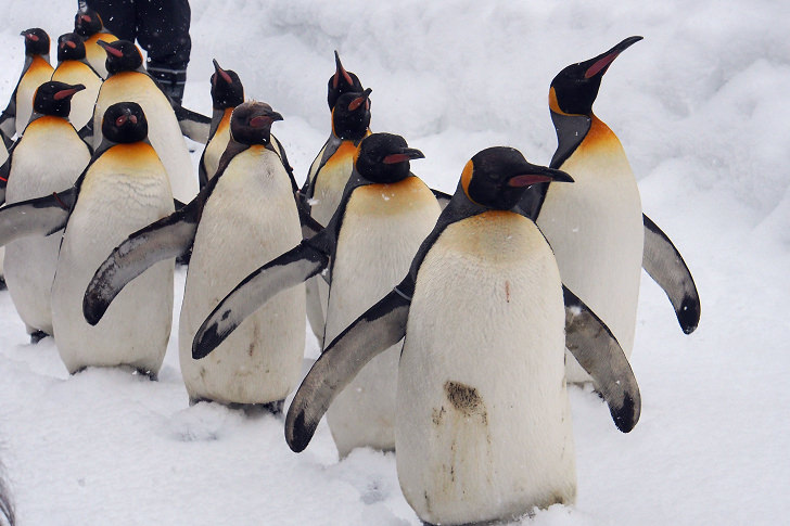 位於北海道旭川市的旭山動物園,冬天有一項非常特別的表演節目,那就是『企鵝散步』了。這可是只有冬天才有機會看到!據說國王企鵝原本就有集體走到海邊去覓食的習性,園方就想到活用這一點,讓他們在冬天的時候出來走路,順便減少企鵝們冬天沒什麼運動所囤積的脂肪,簡單講就是減肥啦!