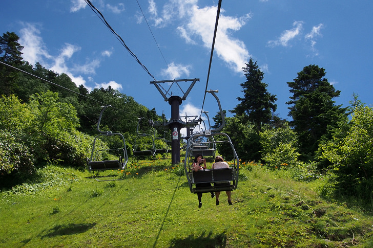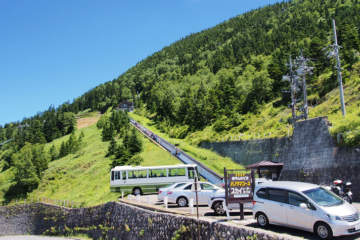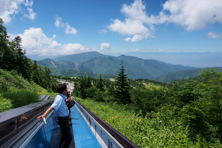 橫手山是志賀高原裡面,擁有最高展望台的山,所以可以眺望非常遠的景色,視野非常良好。這裡原本就是滑雪勝地,是滑雪客很愛來的地方。通往山頂雪場的纜車,夏季也有運行,即使不是滑雪季節,也可以來此坐纜車眺望遠處美景。而連結纜車站到馬路的部分,還設置了自動步道,所以完全不需要花費爬山力氣,就可以抵達展望台,可說是非常便利。 |