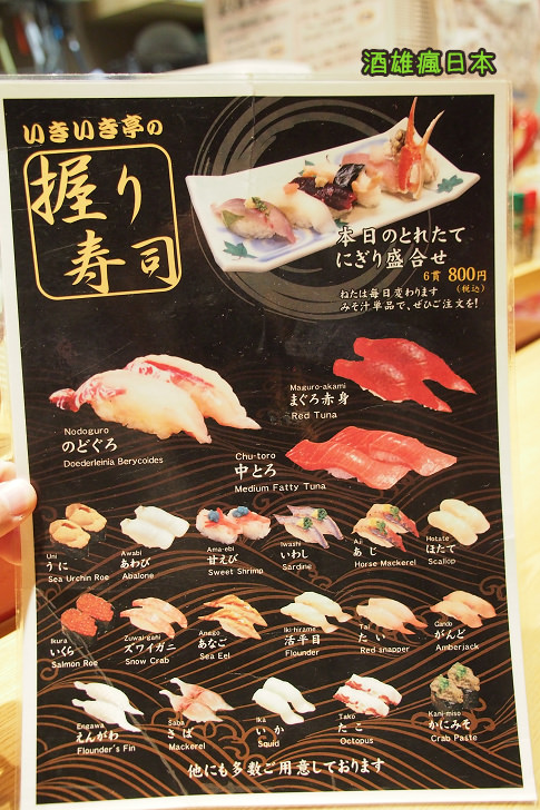 有甜蝦、蟹膏、松葉蟹、鮭魚卵、玉子燒、鯛魚、鰤魚、鮪魚、花枝等等