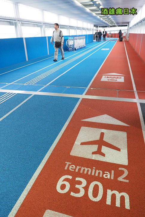 | 來到第三航廈,一定會被地上的PU跑道吸引住目光,其實他不是看起來像而已,材質也真的就是跑道,踩起來有點軟軟的,非常有趣。踩在上面的會很想跑步XD。