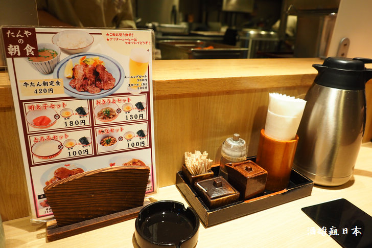 我逛了一圈之後,選擇了賣牛舌的「たんや(牛舌屋)」,因為我難得沒有自駕(是因為颱風讓我班機延後一天回來),當然要體會一下從早就開始喝的豪邁感覺。店內有桌位也有吧台位,一個人的話基本上都是坐吧台,店內沒有禁煙,如果很在意的話,可以請店員安排比較裡面的位子,因為抽煙的幾乎都坐在吧台。