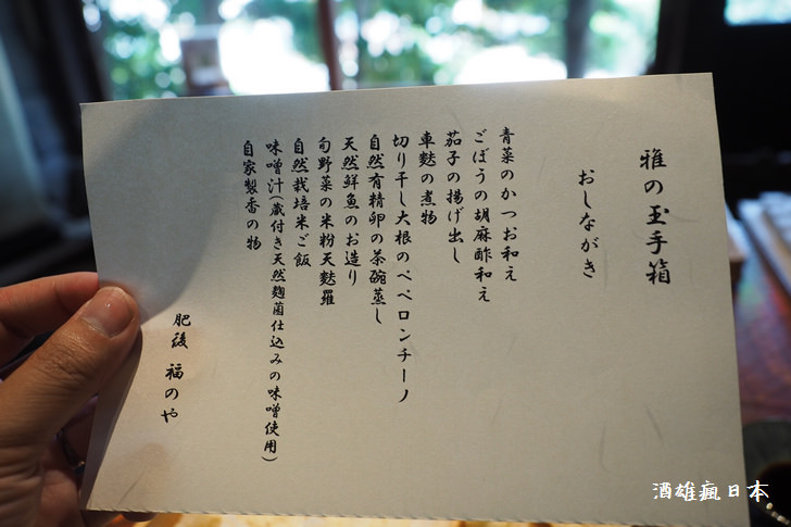 光是環境就讓我很驚豔了,想不到餐點更是別出心裁。餐廳可說是複合式的,白天可以當咖啡館,餐廳,晚上也有提供酒類飲料,可當成小酒吧來喝東西。午餐提供一個玉手箱(就是蒲島太郎開了就變老頭的箱子,俗稱寶箱)服務生端來的時候,說明不但是所有食材都是採用熊本當地農夫生產的,就連便當盒也是經在地職人的巧手製作而成,筷子可以從箱子旁邊取出,我還在讚嘆這精巧的設計時,服務生馬上補一句,這個筷子也是喔!我真想問,這裡有什麼不是熊本在地的嗎?