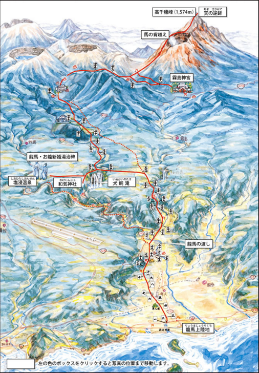 龍馬在寺田屋事件中,雖然性命沒有危險但傷了手,為了治療手傷,決定前往傳聞有療傷作用的塩浸温泉,就帶著愛妻『阿龍』一同前往溫泉所在的霧島(鹿兒島縣),也順道前往霧島神社參拜,以及爬聖山「高千穗峰」。這趟旅行,被後世認為是日本蜜月旅行的起源。龍馬大哥,你好潮啊!