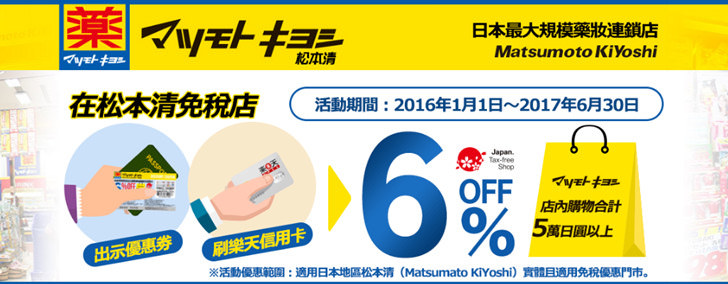 於松本清購物滿50000日幣,免稅之外還享6%優惠