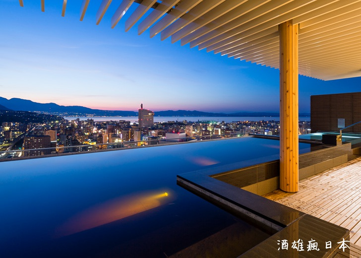 如果要使用頂樓spa,只要把房卡帶著,毛巾之類的都會在spa櫃檯提供給我們,不需要從房間帶去,因為spa有對外營業,所以入浴客人會比較多一點。同樓層裡還有可以看城市夜景喝小酒的BAR。浴池內部分成上下兩樓,下面是室內浴池,上面則有露天浴池,天氣好時可以看到遠處別府灣的景色。