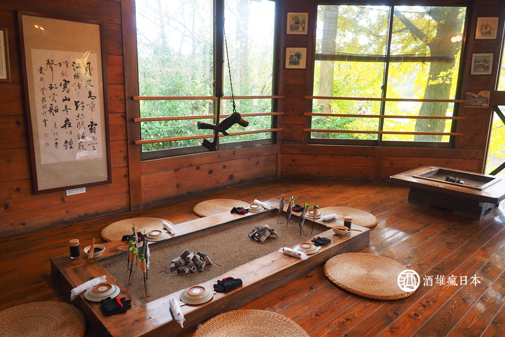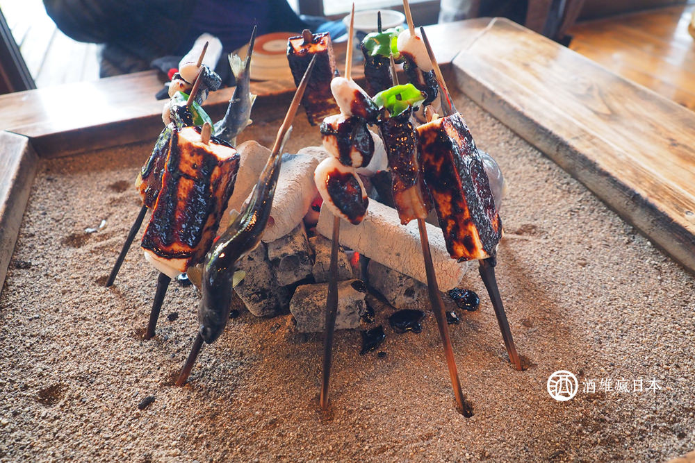 這裡是『高森田樂保存會』,可以在日本老房子中吃田樂料理,所謂的田樂,就是把像是芋頭、蒟蒻、豆腐之類的食材沾上田樂味增(一種深色濃郁口味甜甜的味噌),等到表面的味噌都烤乾。味道也就都進去食材裡面,就能吃了。除此之外,烤一隻山女魚也是一定要的!