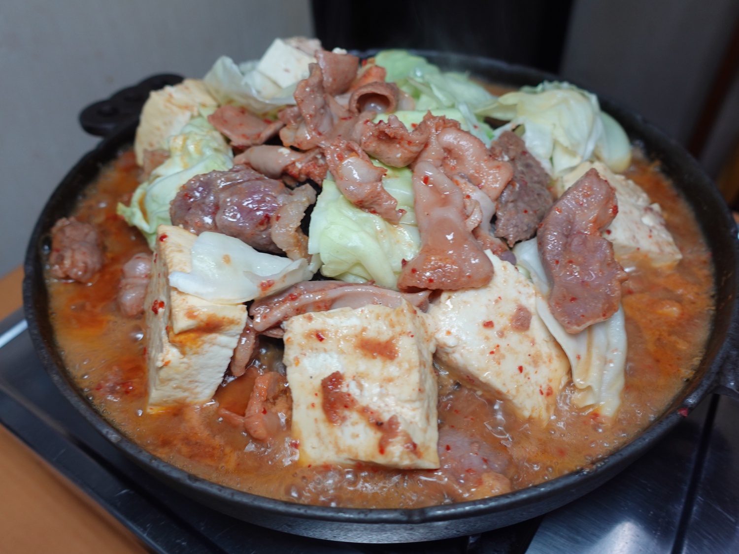 是用中心突起,類似銅盤燒肉的鍋,然後把醃好的內臟鋪在中間,並在豆腐鋪在四周溝槽,然後再把高麗菜放在肉上面,內臟烤+蒸熟之後,蔬菜跟豆腐也吸收了內臟的精華,變得很美味!點內臟(340円)、蔬菜(210円)、豆腐(310円)剛好成一套組,因為很下飯,也建議可以點白飯哦!