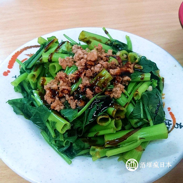 メニューの一番右の燙青菜(茹で野菜)です。これもルーローがたくさんかかっています。燙青菜を注文する際、注意すべきのは、野菜は何種類ある可能性があることです。写真は空芯菜ですけど、ときには地瓜葉(サツマイモの葉っぱ)だったり、豆芽菜(もやし)だったり。