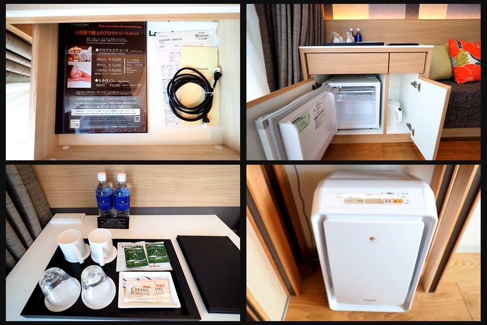 接下來就是一些只有這個房型才有的配備,像是HDMI端子,就能用電視看相機裡的照片。而電視下面的則是藍芽喇叭,除了提供更棒的音質之外,也可以播放自己手機裡的音樂。電視角度可以調動,在房間裡不同角落都能欣賞電視。床頭邊則是配備了蒸氣加濕器,睡眠時更能保持房間的舒適。