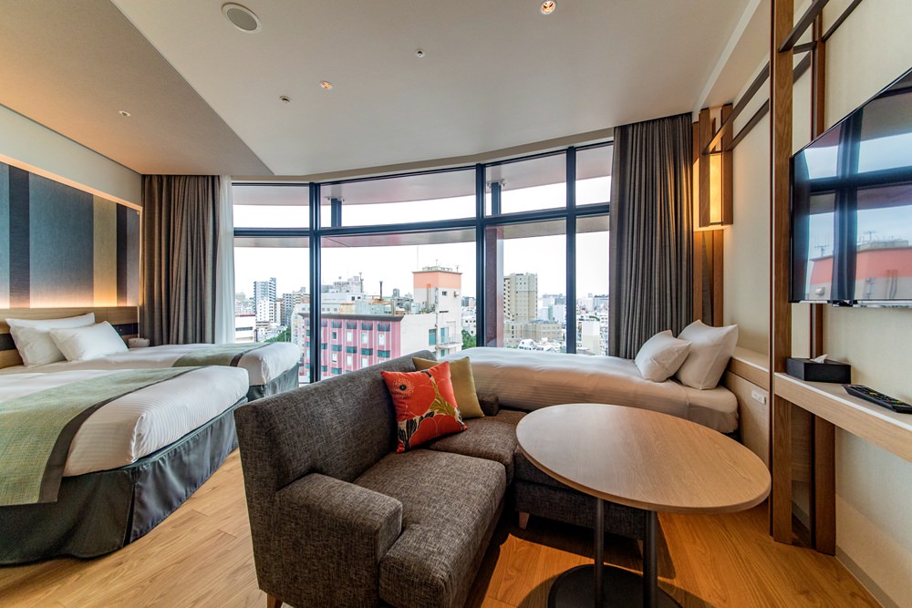 JR九州BLOSSOM那霸飯店,於2017年6月24日正式開幕,距離熱鬧的國際通僅有1分鐘的步行距離,距離最近的單軌車站則是徒步5分。共有218間房,都是雙人房以及雙床房型,全室禁菸,且都有大大的落地窗,房間大小從23~34平方米,以那霸鬧區來說,這樣的寬敞與舒適是很少見的。