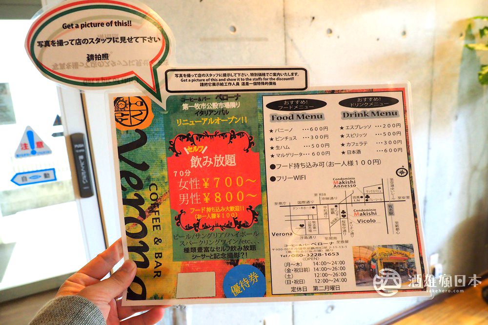 ▲在大廳看到這張介紹,原來飯店老闆也投資一間酒吧,位於公設市場附近,如果拍上圖到店,就可以男生800日幣、女生700日幣的優惠價格享受70分鐘酒精飲料喝到飽的服務。(而且下酒菜還可以自備)