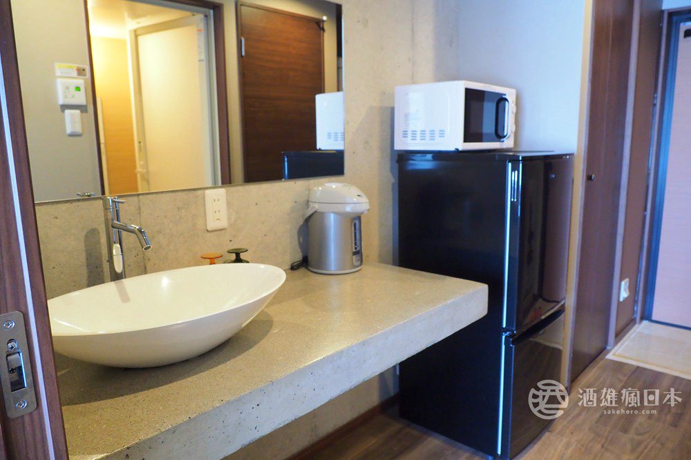 ▲一進門就是洗手台與工作檯面,家電有熱水瓶、冰箱、微波爐。冰箱很大,可以冰足飲料跟食物!
