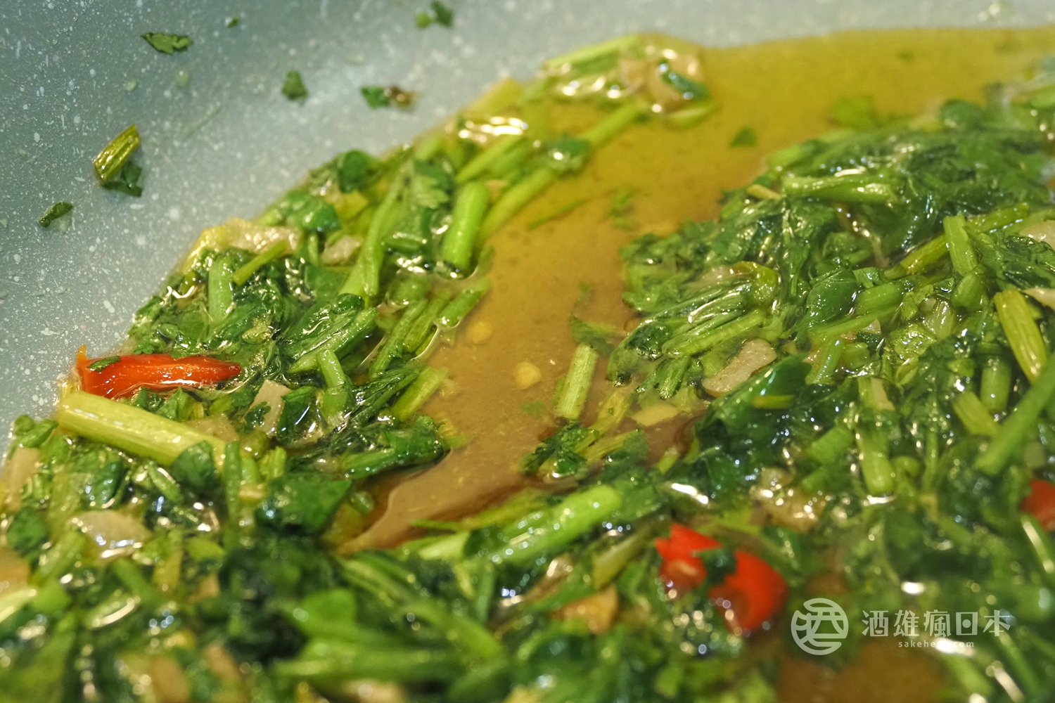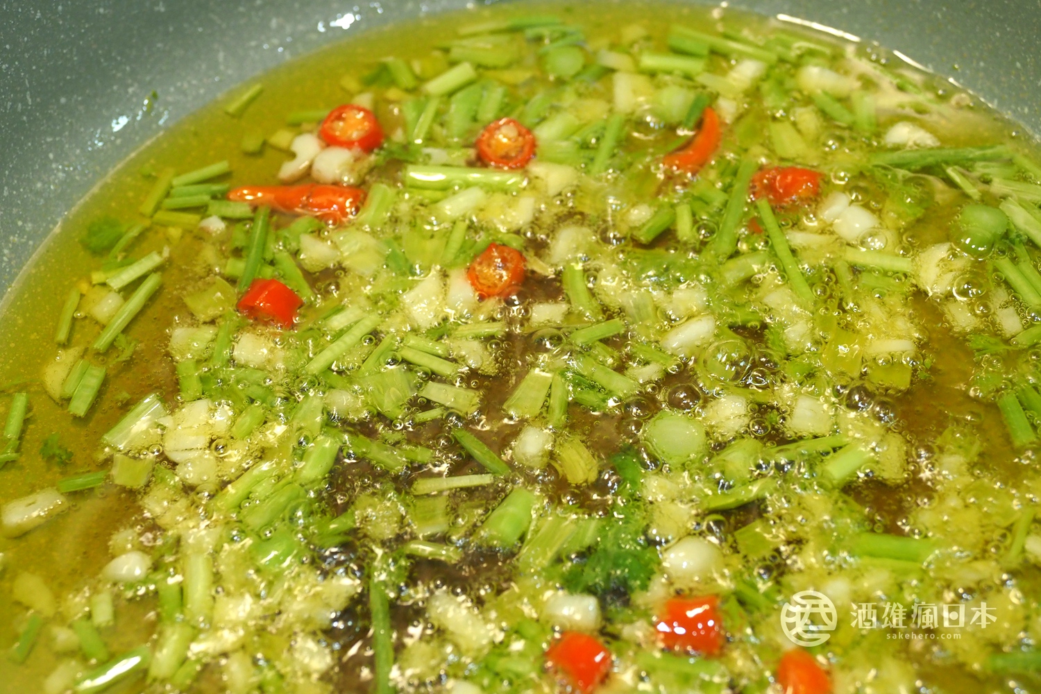 - 冷油開鍋,並加入香菜根、大蒜、辣椒爆香