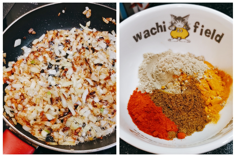 ①製作咖哩醬:炒完整香料、炒薑蒜、炒洋蔥、拌炒番茄、拌炒香料粉