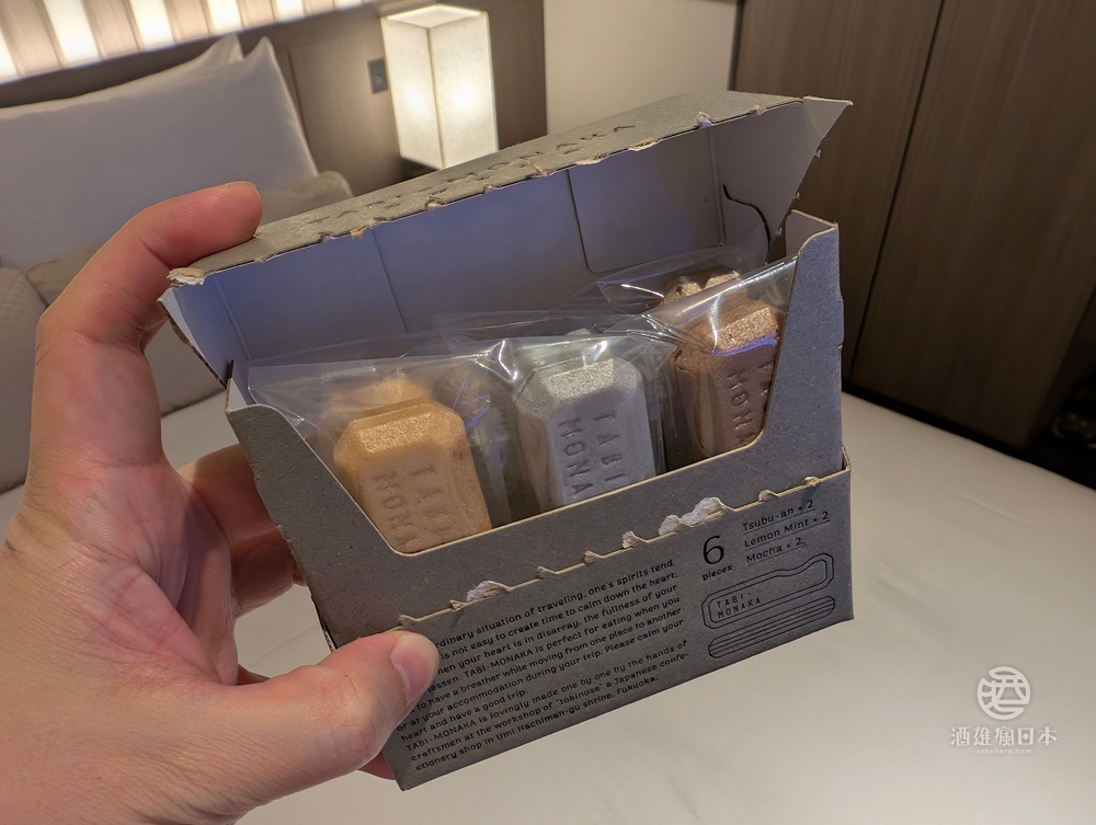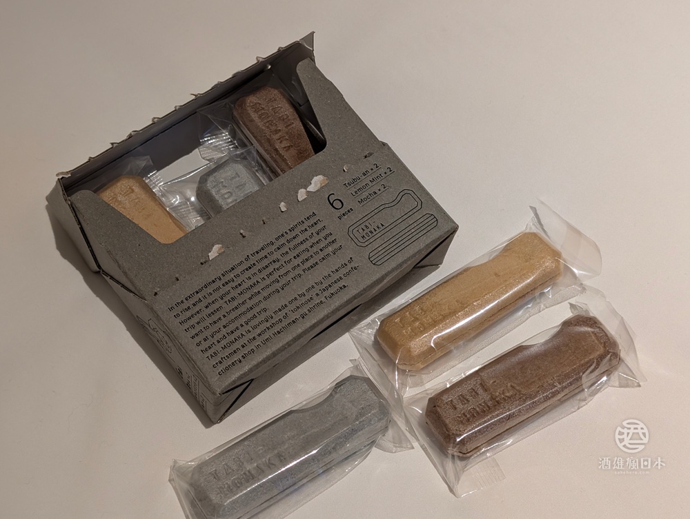 由和菓子店「季のせ」以及福岡文具、雜貨公司「HIGH TIDE(ハイタイド)」聯名推出的文具風最中餅,非常洗鍊俐落的外包裝設計,讓人真的很想帶去旅行。他共有三種內餡(口味):顆粒紅豆餡、檸檬薄荷、摩卡,有傳統也有創新,我最喜歡摩卡口味,使用白豆沙餡加上咖啡及巧克力,還有烘烤過的杏仁碎,吃起來甜中帶苦,口感豐富,頗有大人的味道。