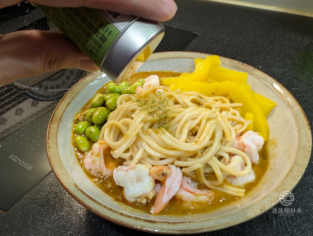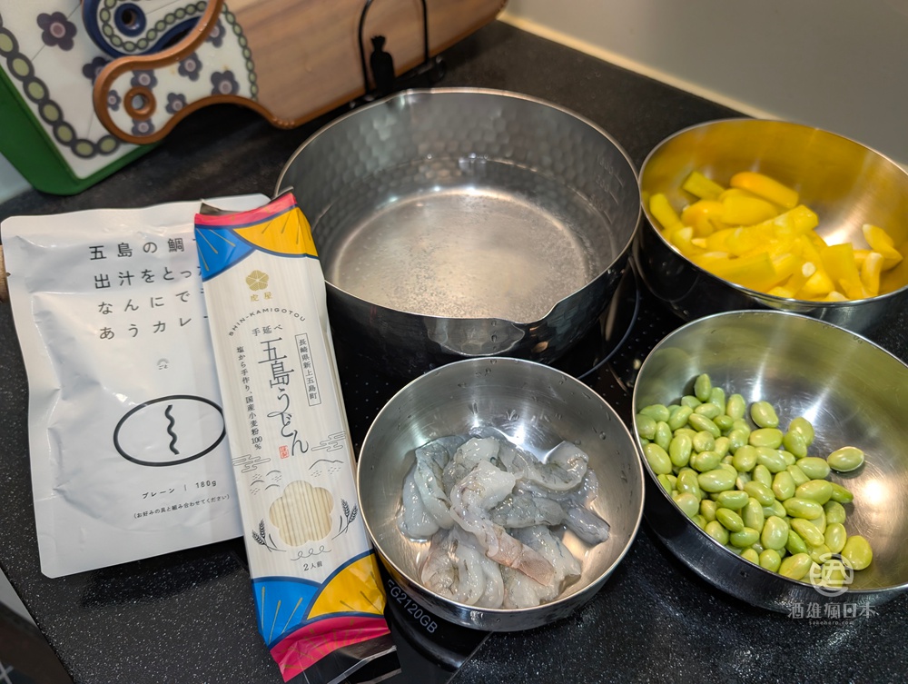 咖哩包加熱倒入容器,加入30~50CC昆布高湯並混合,其他食材川燙後鋪在麵上,就變成超美味的咖哩烏龍麵了!