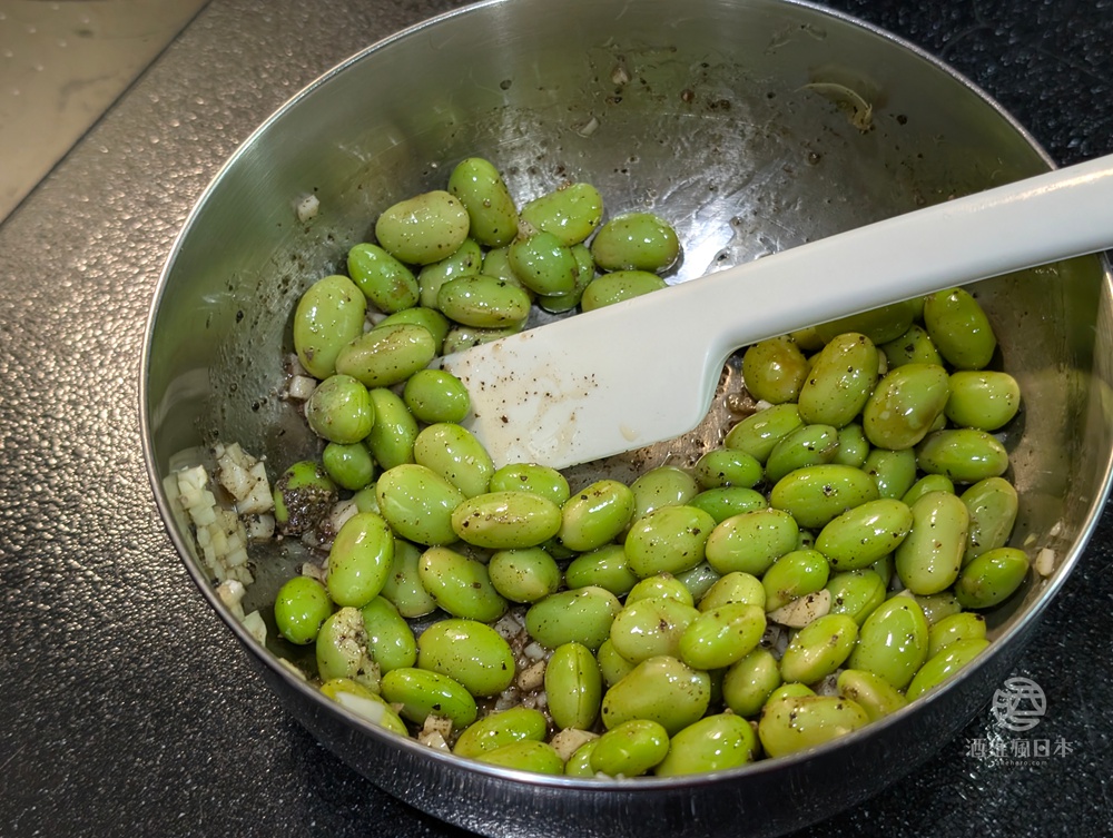 ▲毛豆仁先用鹽水川燙,加入蒜頭碎、麻油、現磨黑胡椒,涼拌一下就是超強配菜。