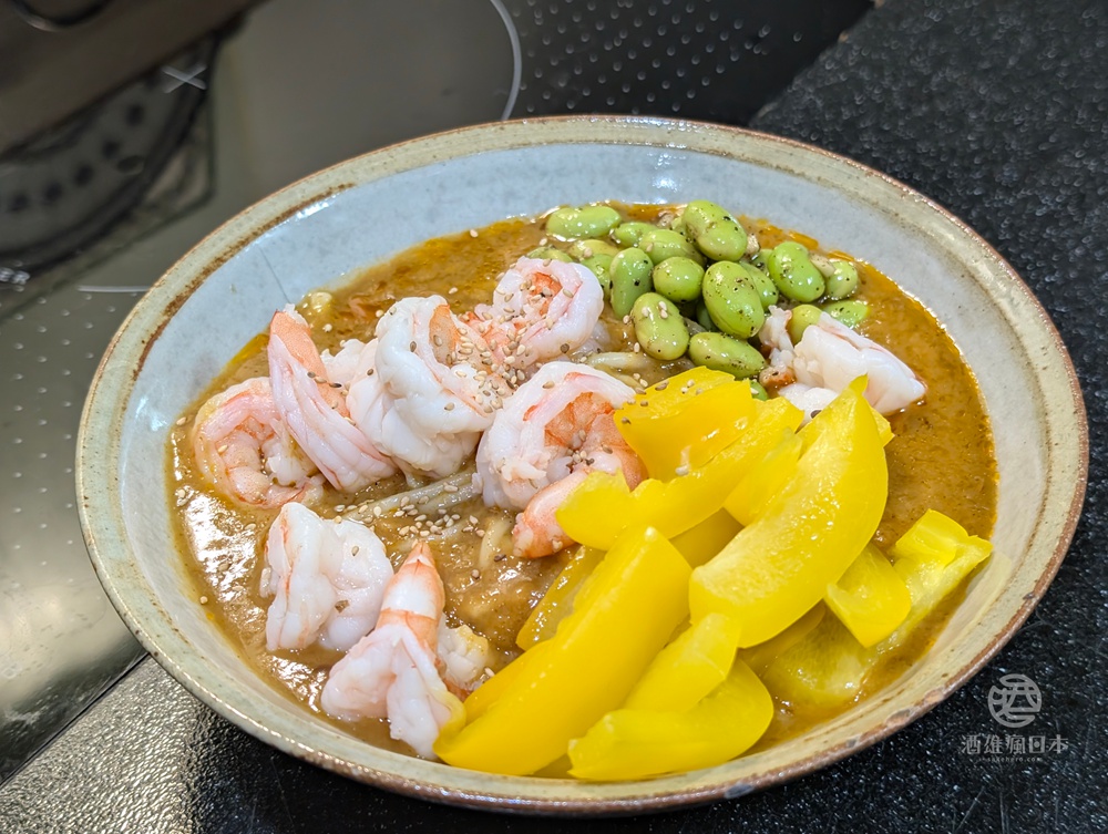 準備了食材有:鮮蝦仁、甜椒、毛豆仁、以及昆布高湯