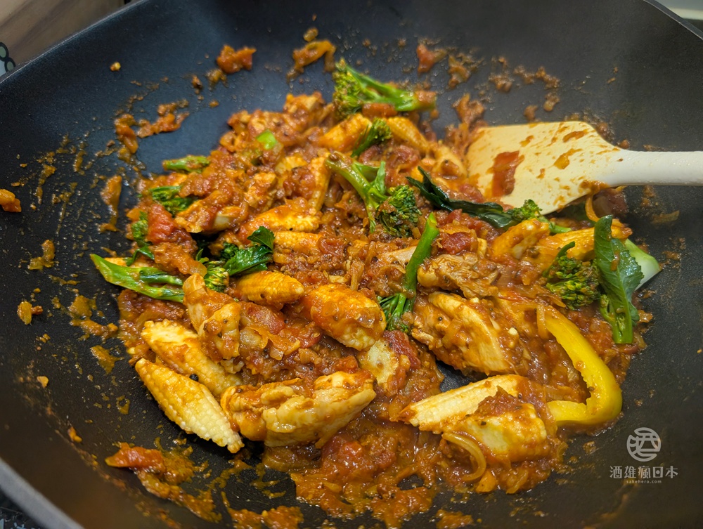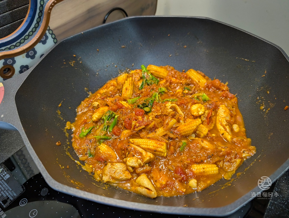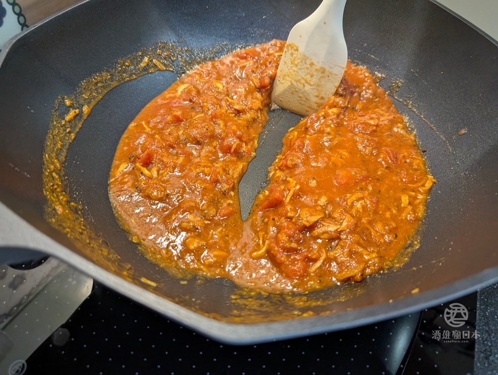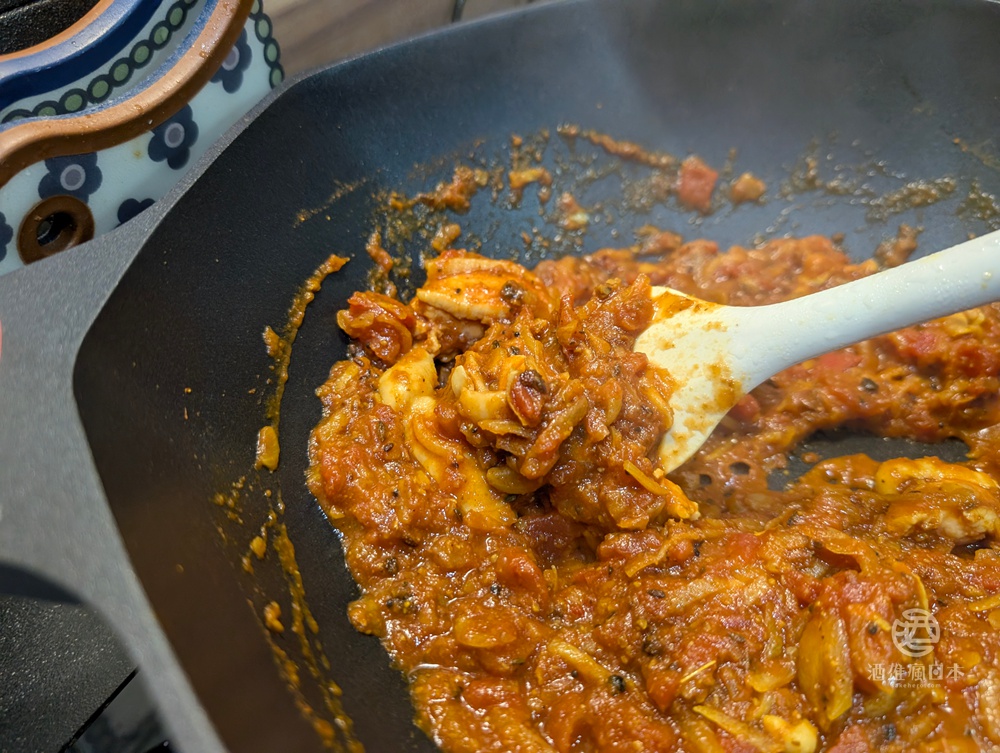 雖然說明寫加入200cc的水,但為了更享受至做咖哩的過程,我先加入100cc水以及番茄罐頭。商品本來就有油,所以不需另外加油。入鍋後,先把番茄搗碎,大概才3分鐘就等於是平常要花30分鐘的狀態,咖哩醬就算完成了。