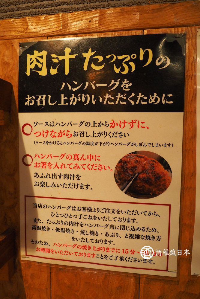 牆上海報說明他們家的漢堡排是非常講究的,他們甚至會怕淋上醬汁時會把漢堡排降溫,影響口感,所以建議醬汁不用淋的,而是用沾的方式。然後漢堡排上桌的時候,可以試著用筷子從中間挖洞,可以欣賞到肉汁滿溢出來的瞬間!這真是讓人太期待了!