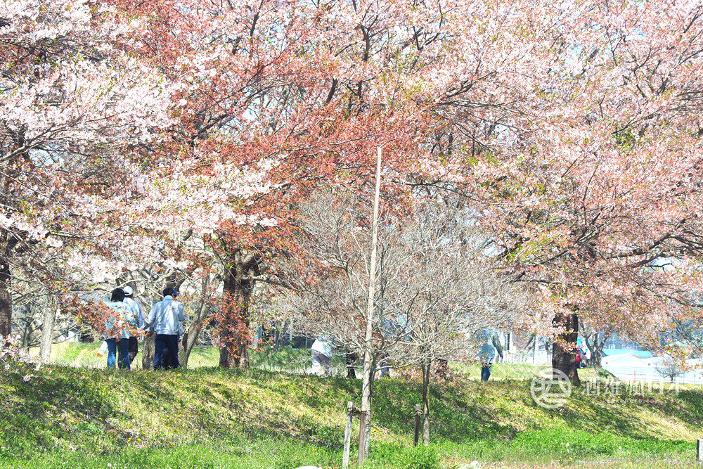 邂逅之森草莓園的附近,基本上就會是我們停車的地方,旁邊正好是一整片的櫻花河堤,雖然已經過了最棒的時間點,但還是吸引了我們的目光。