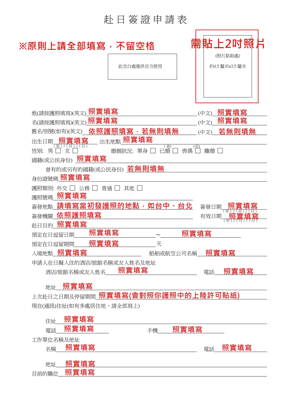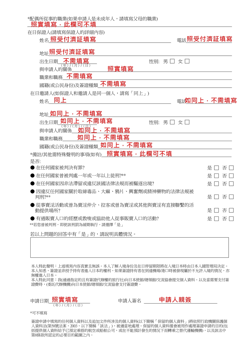 - 受付濟証不接受別名,一定要填第一個名字,如果護照有別名,請提醒日方不要填錯名字。