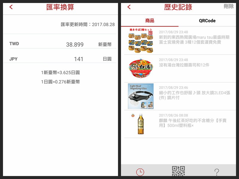 匯率每天都會更新,所以不用擔心資訊不夠新。這個功能對於要幫親友代購藥品、化妝品的非常有幫助!就不用另外開計算機的APP了!查詢過的商品還會保存在「歷史紀錄」裡面,方便之後查詢。