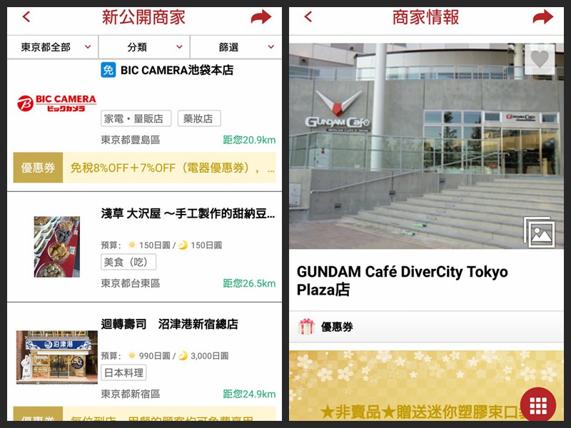暢遊日本APP網羅了許多美食、購物、旅遊景點資訊,如果你一下子不知道要去哪邊玩,不妨使用地圖搜尋功能,馬上可以檢視周邊有沒有什麼好玩的地方。如果看到有興趣的商家,可以點進去看看更詳細的說明,有些還有優惠券可以下載哦!