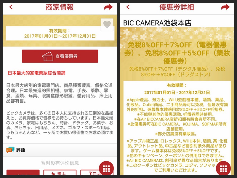 有些商家可以下載優惠券,下載後會幫你存在「我的最愛」,要結帳的時候再出示給櫃檯,就能享有折扣,完全不需要列印出來,非常方便。較大型的連鎖店,像是:BIC CAMERA、松本清、大國藥妝也都有提供折價券。