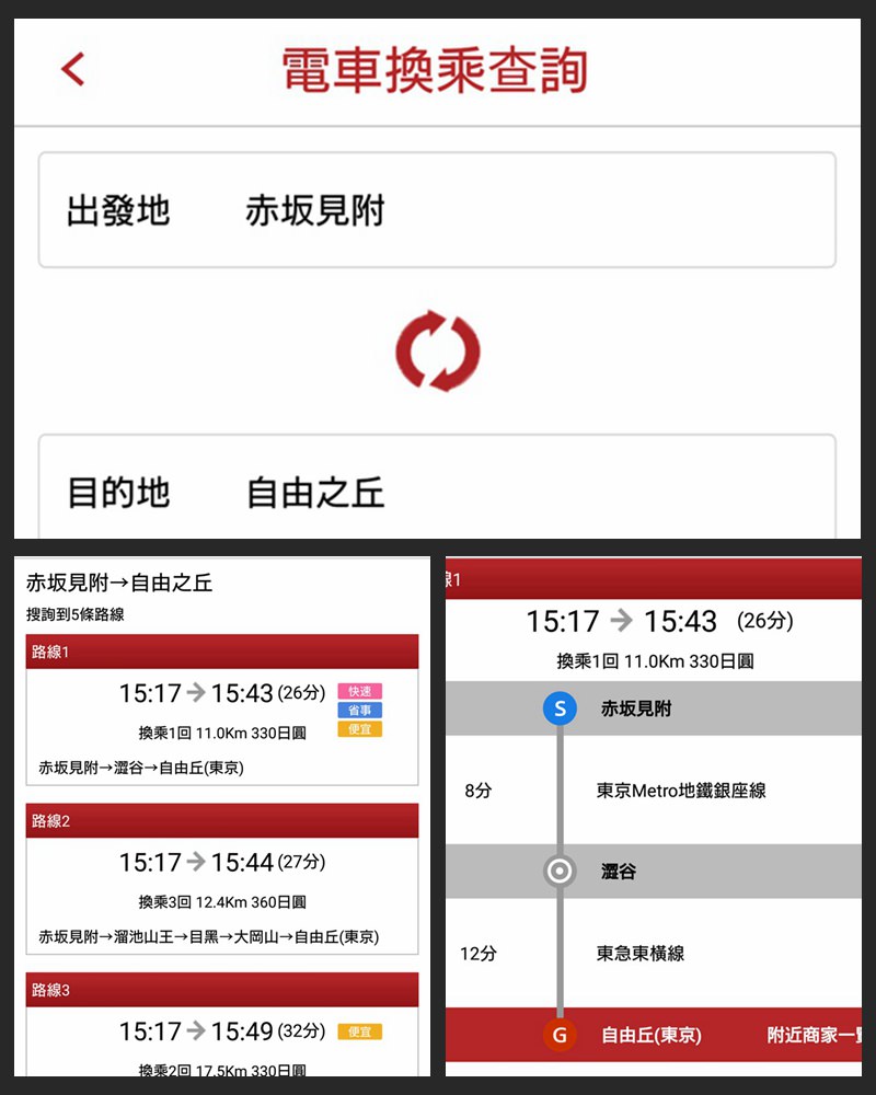 只要輸入站名,就能快速查詢,並提供三種便利的轉車方案。每個路線點進去都有更詳細的資訊,所需時間跟費用都有一併提供給你,也能用地圖搜尋站點附近的商家資訊。對於不會打日文漢字的朋友來說,這個APP輸入中文就可以了,更容易找到需要的站點。