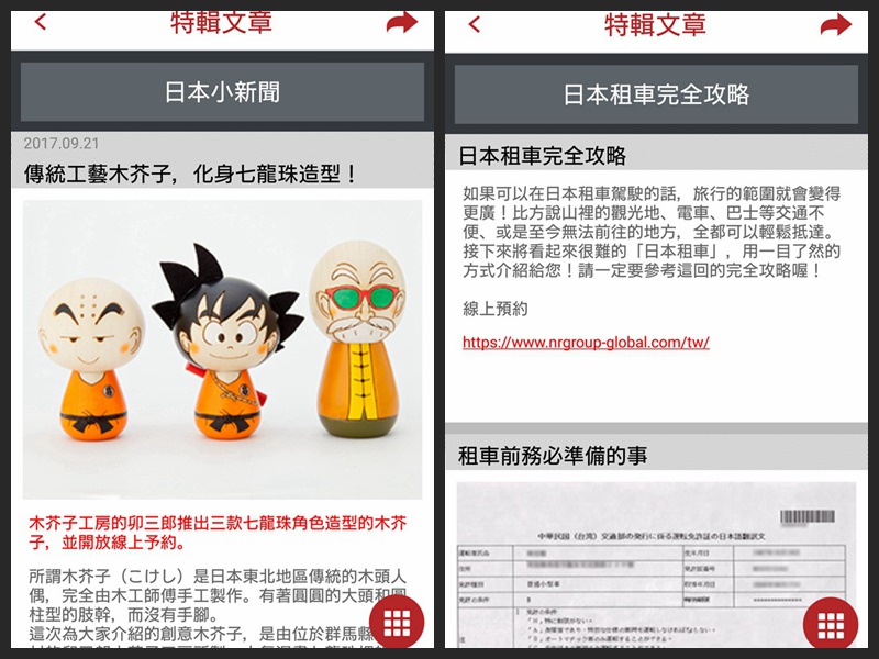 除了搜尋的功能之外,「暢遊日本」也準備了很多專題內容,內容五花八門,有最新流行商品的介紹、商品人氣排行榜、租車相關資訊、達人帶路景點資訊、以及地區性體驗內容等等。雖然不是說光靠這個APP就能完成旅行的功課,但肯定是不錯的參考!很期待他們未來可以更加充實哦!