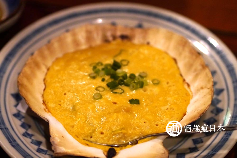 這是把扇貝貝殼當成鍋子,是用柴魚高湯煮蔥等蔬菜,並加入味噌跟扇貝的肉,最後再打蛋下去使他凝固的料理,甜甜的很好吃!