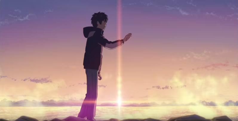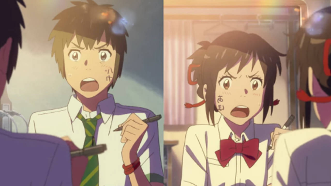 不管以前有多麼的想離開這個小地方,不管曾經如何怨恨自己的故鄉,但知道了村子即將毀滅的消息,仍然是拼命想救全村人性命的三葉,不小心跌倒滾落一個斜坡,想要放棄的她,忽然想起瀧說的「為了不要忘記,我們互相寫上名字吧」,三葉打開手心一看,發現上面寫的不是名字,而是「我喜歡你(すきだ)」
