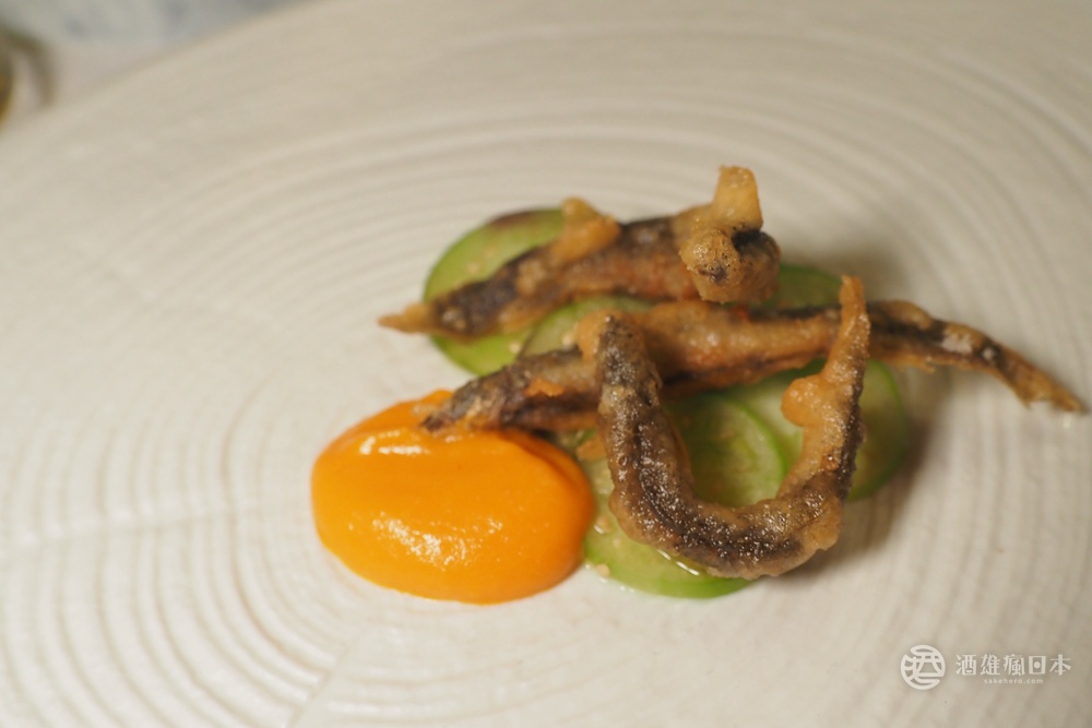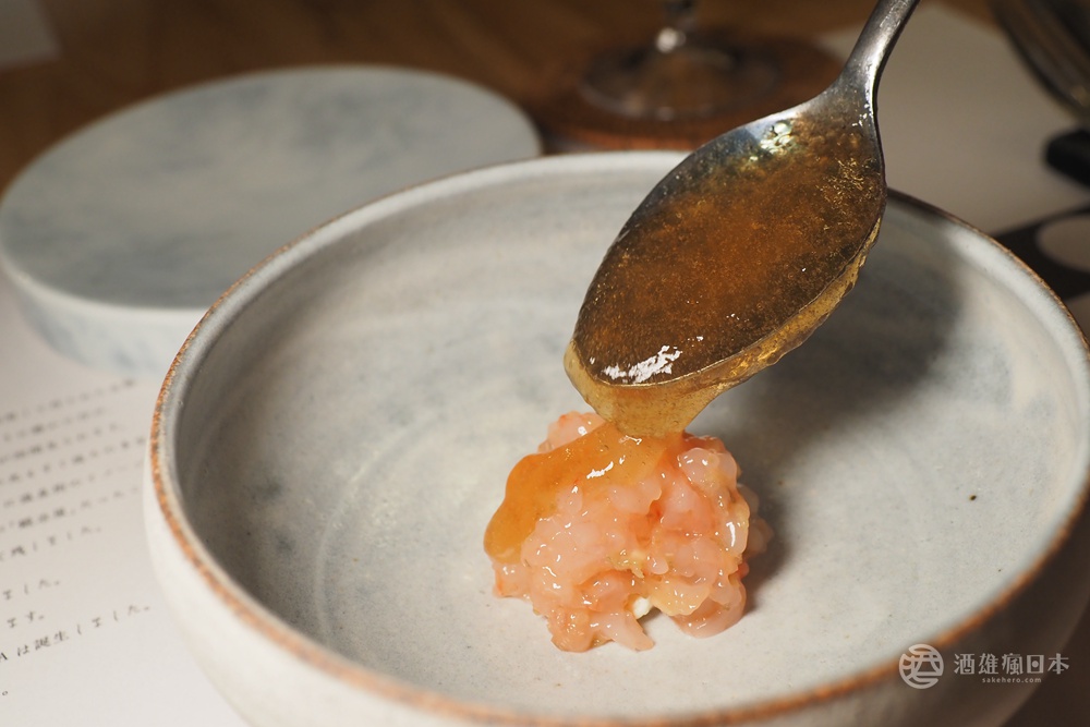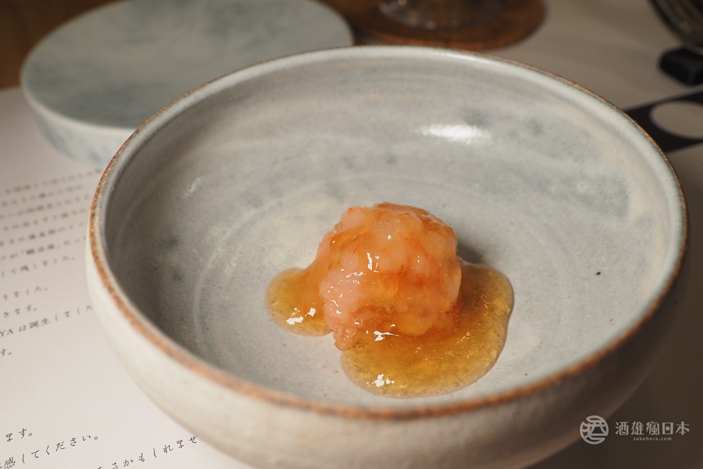 菜名我就不一一翻譯了,畢竟他們也是會一段時間換菜單的。南蠻海老是產於日本海的甜蝦品種,被視為日本海的珍寶,不只味道很好之外,研究上還說對身體健康很有幫助。這道是南蠻海老的韃靼,佐的是山古志和牛做的法式高湯醬凍,上菜時還炫技了一下做了小小的煙燻,吃起來非常有層次。