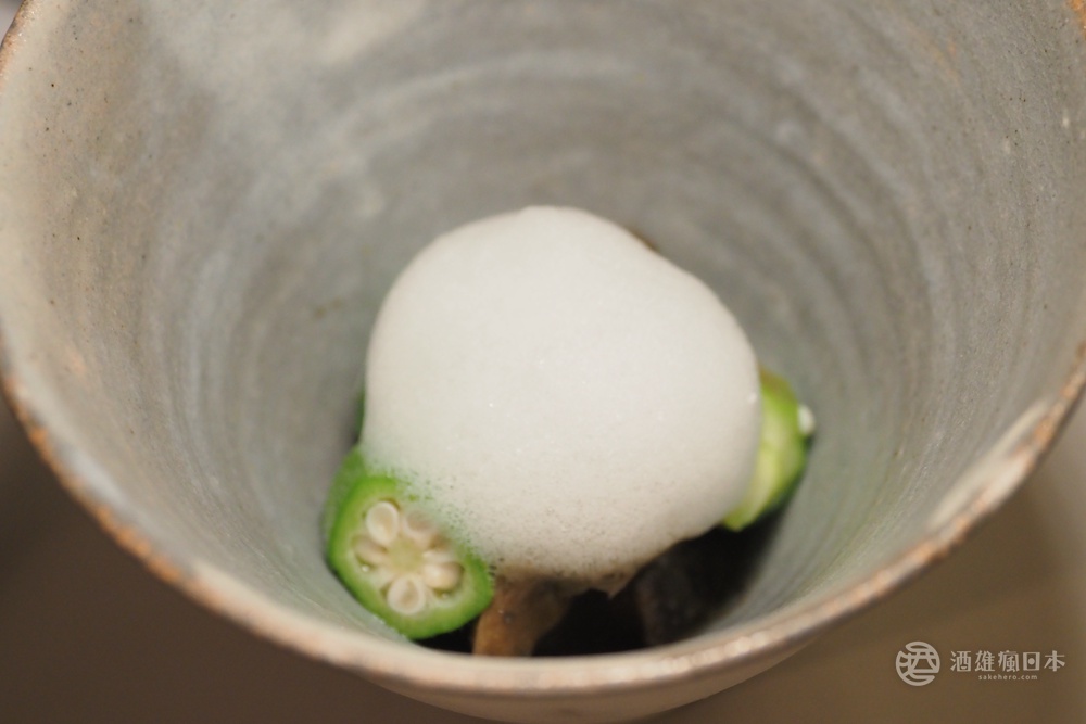 鮎と切干し大根の出汁と大葉、蓼のオイル