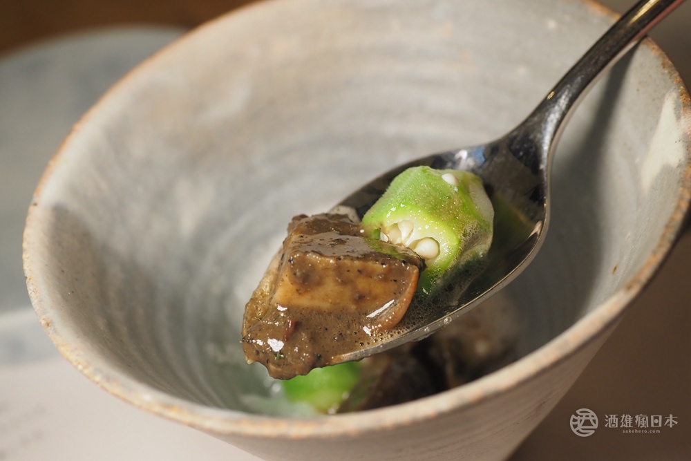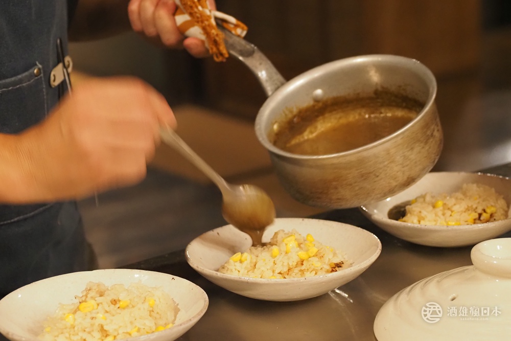 玉米及南蠻海老高湯炊飯,淋上鮑魚肝及發酵香菇以及烤青椒醬汁。本來看醬汁還以為是咖哩飯,沒想到竟然是這麼複雜的一道料理。熊倉主廚說本來他都是出燉飯,比較有義大利菜的感覺,但客人大多來自縣外,他們很期待吃到美味的越光米,才改成這樣的炊飯。