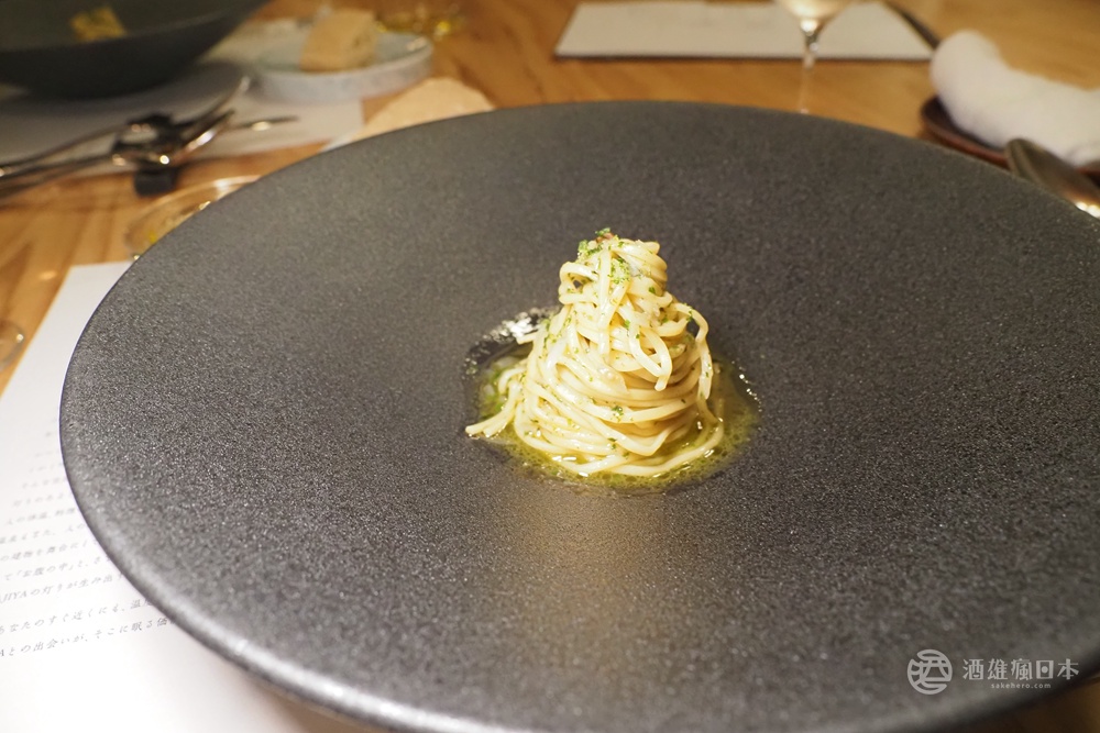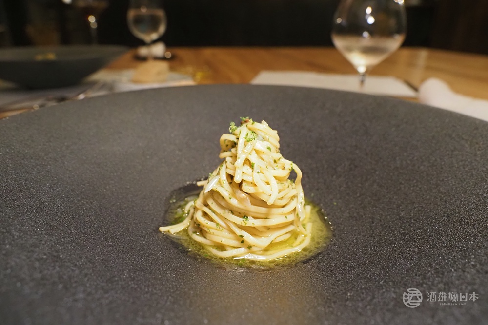 這義大利麵竟然是手打的,熊倉主廚真的什麼都會做嗎?搭配的是香魚跟與蘿蔔干絲取的高湯,再加上紫蘇碎與木天蓼油。雖然我不是貓,但我吃到這個麵也是超開心的耶!