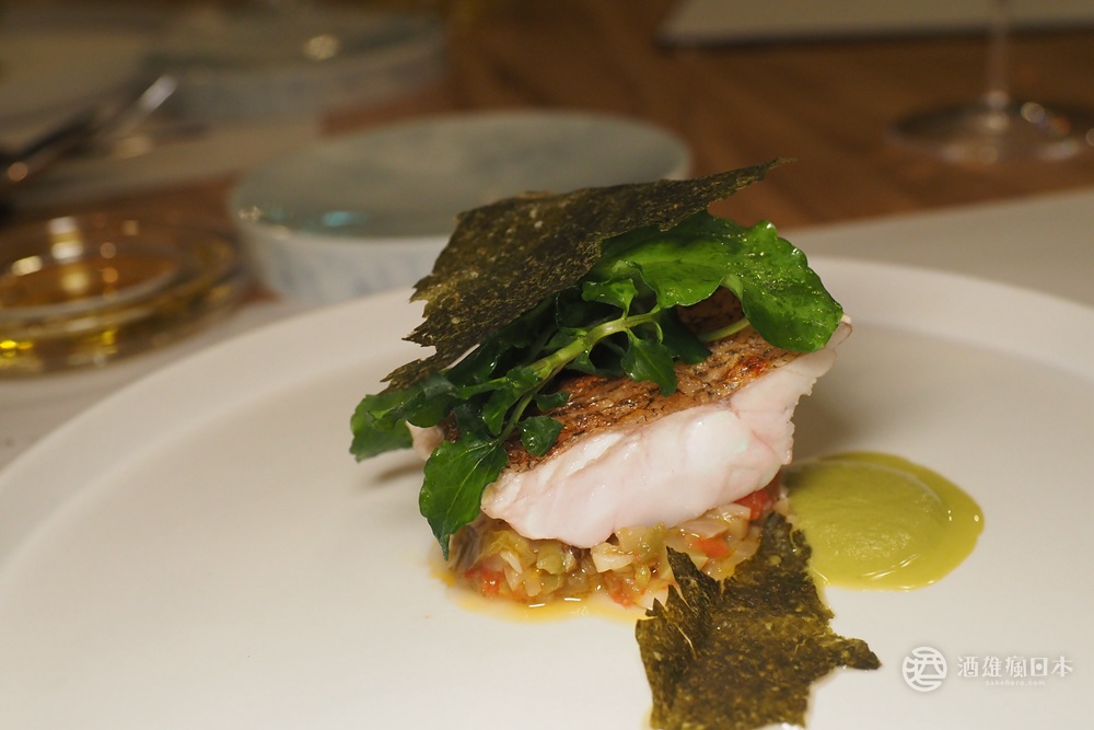 炭烤赤點石斑,底下是切碎的夏季蔬菜,加小酸模醬汁。另佐海苔與薄荷脆片。雖然單吃炭烤魚肉就非常美味,但加上各種味道之後,變得更加豐富,非常有趣。