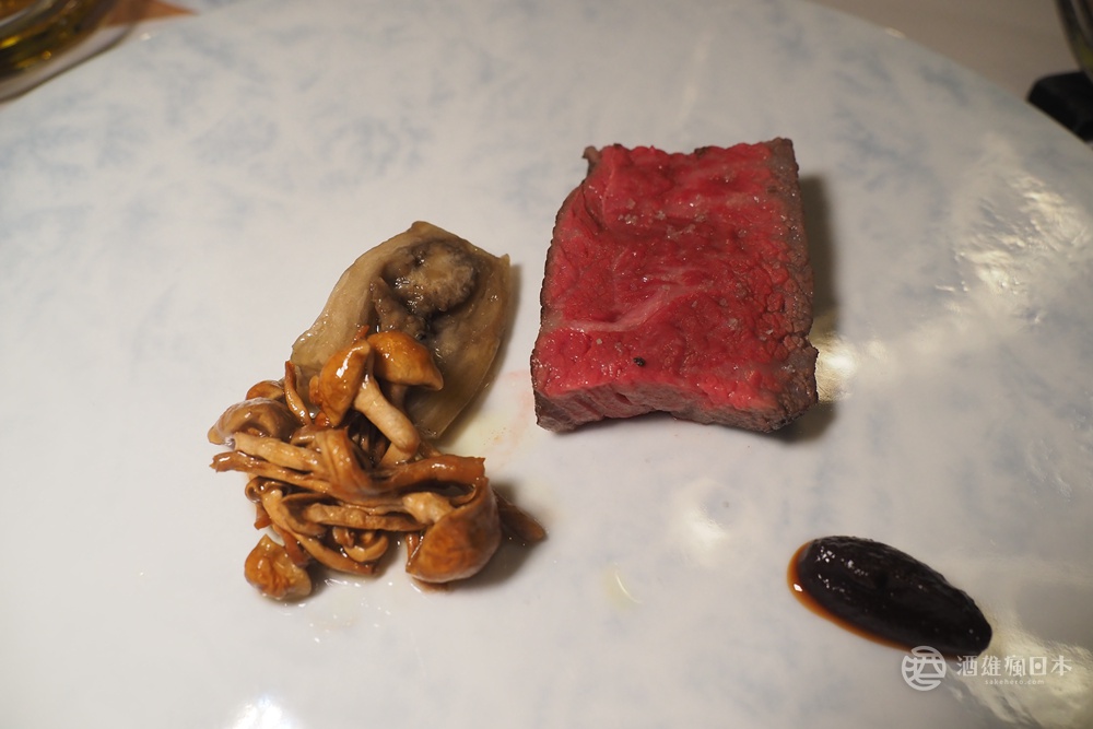 用稻草烤的山古志和牛,搭配發酵大蒜及三年熟成味噌醬 另配上茄子與滑菇的酸醬菜。其實一般來說我吃到這裡就飽了,不過這個和牛真的很嫩很香,讓我維持了品嘗它的胃口。