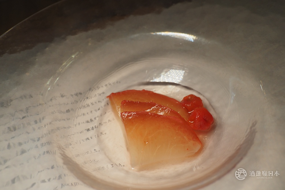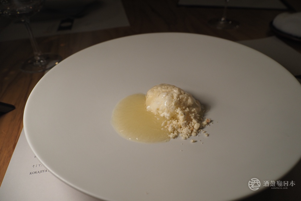 以金巴利減壓調理的白桃,簡單說就是把食材的孔洞擴大,使調味液吃進去食材裡面,又不會受到高溫破壞的調理手法。白桃口感變得QQ的,倒是沒有什麼酒味,吃起來甜甜的很有趣。