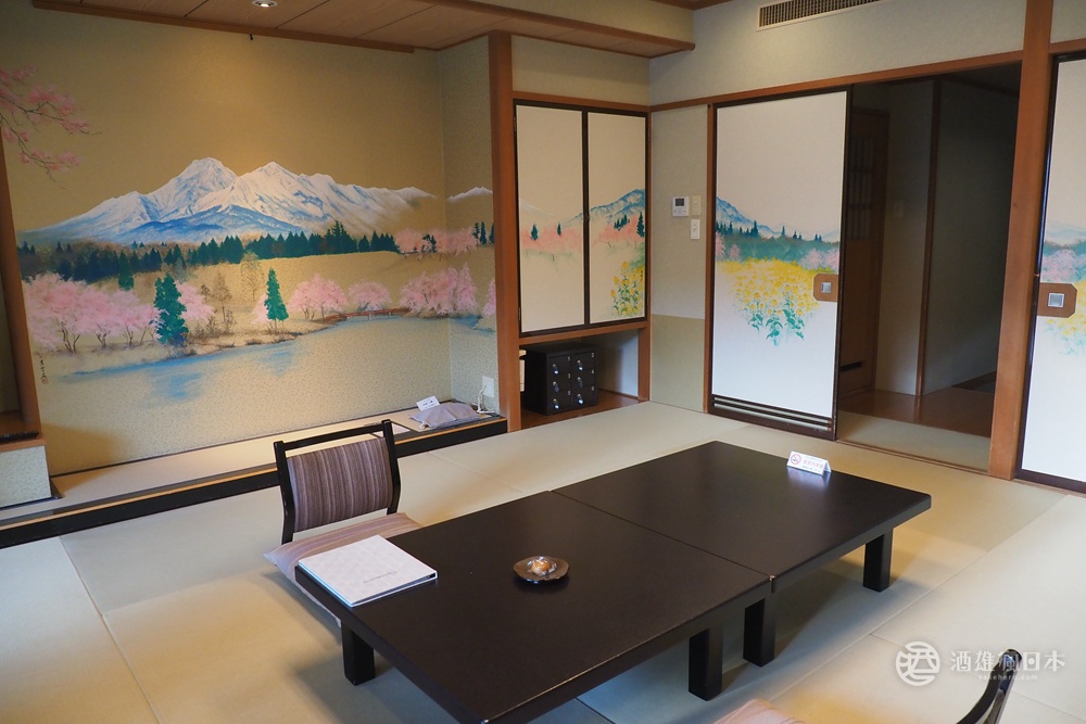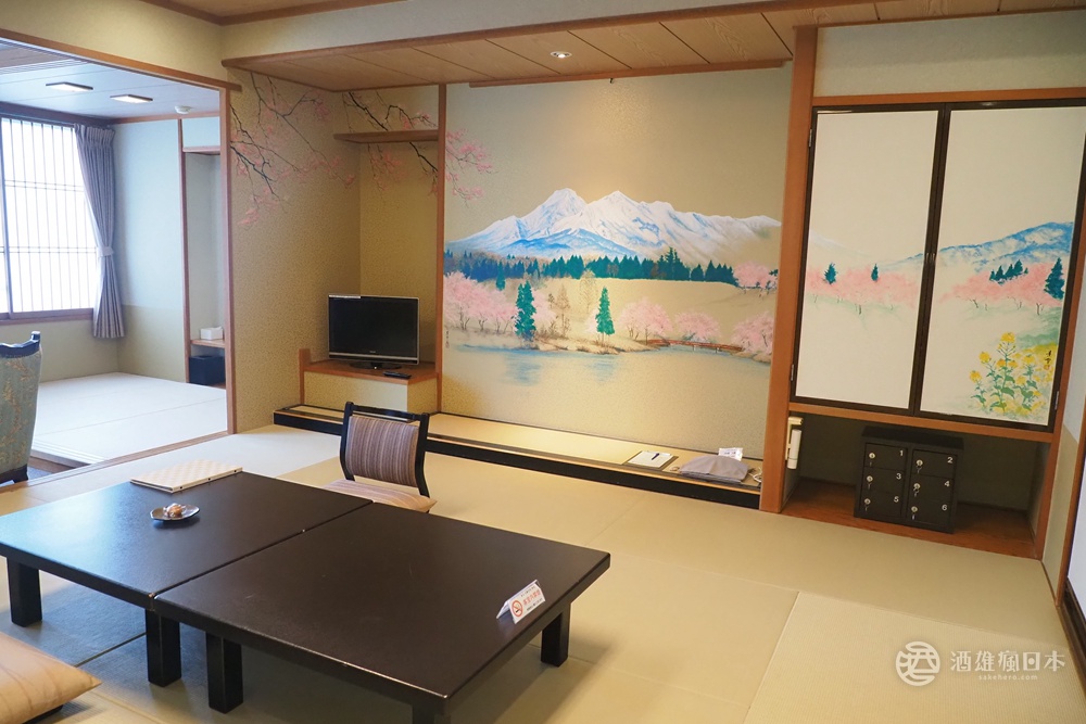 在對方的好意下,這次房間有幫我升級,入住的是「穂々」最有特色的「絵画特別ルーム」,牆上跟壁櫥上都有美麗的櫻花及妙高山,光是加上這樣的繪畫,就讓整個房間氛圍感覺不一樣,真的很神奇呢!「絵画特別ルーム」共有四間,分別為「桜花泰平」「妙高山春爛漫」「角田山春景」「梅花饗宴」等,有興趣的朋友可以來收集一下!