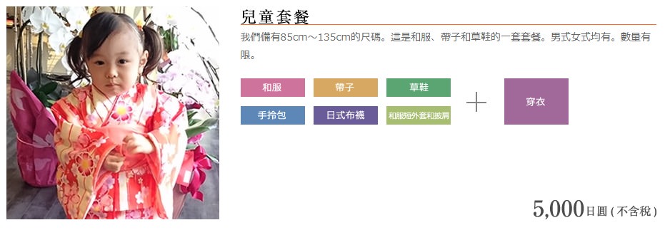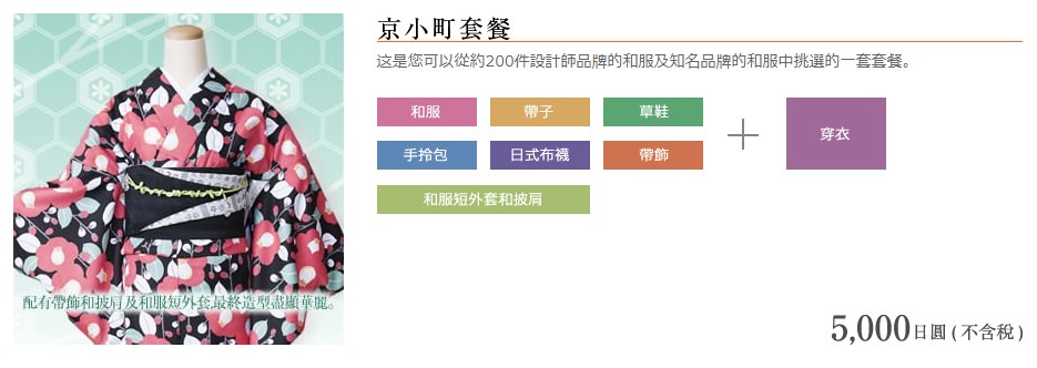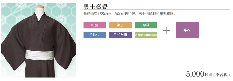▲基本上的方案是以5000日圓為主,雖然也有3000日圓的划算方案,但因為只能穿成套的和服,不能自己挑選,所以比較不推薦。女生的話推薦還能加1000日圓,可以幫你做髮型,男生我看就自己抓一下吧。基本上不管是和服(着物)還是浴衣(ゆかた)都是一樣的價格哦!