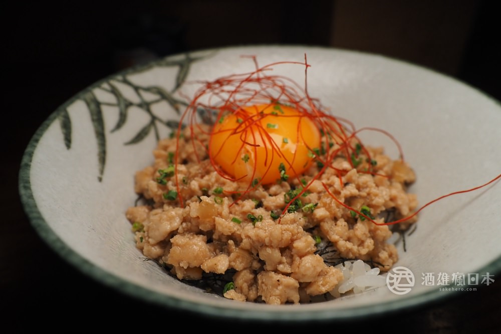 由酒雄好朋友,同時也是台中串燒最強餐廳「鳥苑地雞燒」主廚Tommy研發一個本次活動專用小食,其正體就是「鳥苑雞鬆飯 ft.山形美姬米」。以醬油、酒跟一點點秘方調味的特選雞肉,做成雞鬆,加入白飯好朋友海苔、蝦夷蔥,最後打上一個生蛋黃,加上一點點辣椒絲,美艷動人的料理就上桌了。