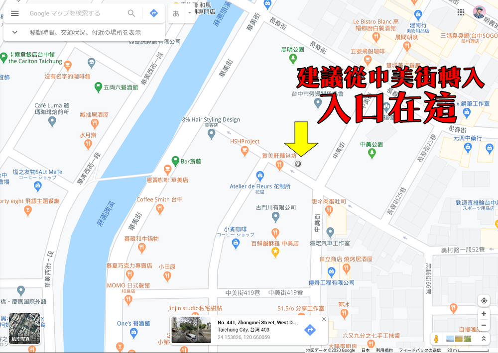 最鄰近的停車場為「忠明公園地下停車場」,入口需從中美街轉入小巷子(請見附圖)。