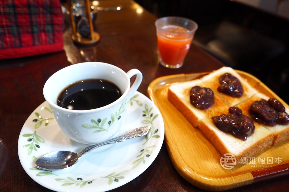 沒錯!名古屋的咖啡館在早餐時段(通常是開店~11:00左右),點飲料就有免費附贈吐司跟蔬果汁。(我加了100日幣,就可以升級為小倉紅豆吐司)