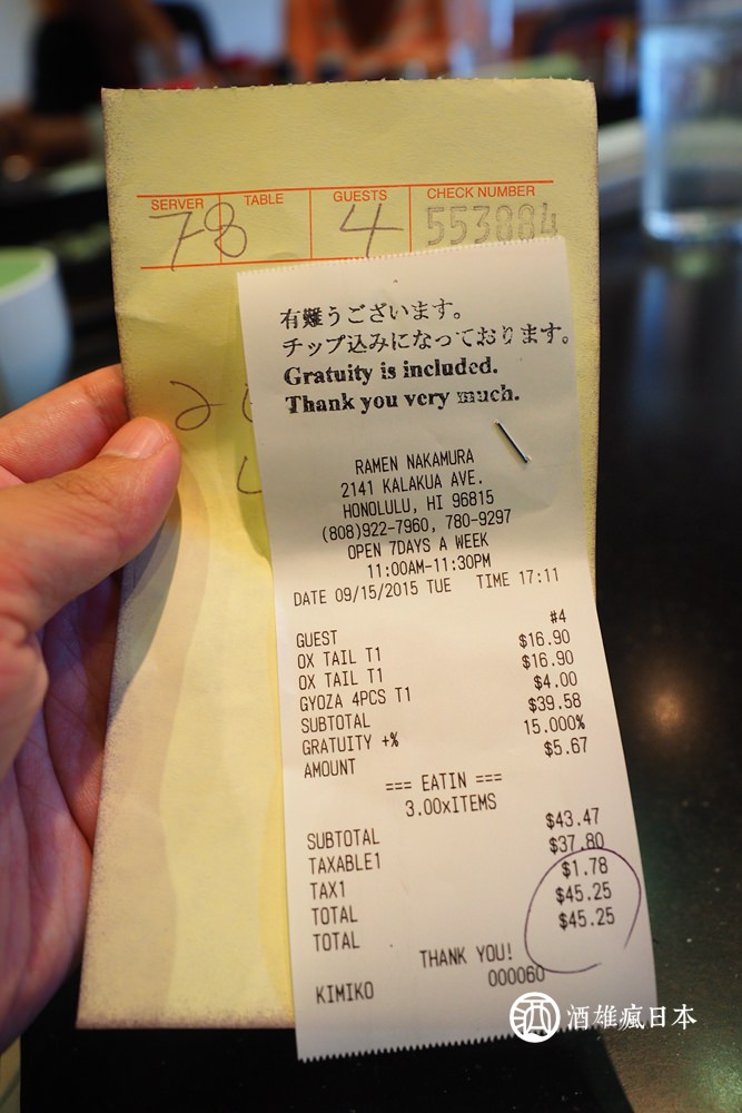 這是我們最後的帳單。兩碗牛尾麵、一盤餃子,這樣是$45.25,換算成台幣大約是1400多元。不過可以了解夏威夷的流行趨勢,個人覺得是還不錯的經驗!有機會的話大家也可以試試看!