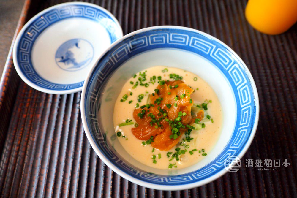 第一道是花椰菜冷湯搭配海膽,說是冷湯卻有種更像是「花椰菜汁」的感覺,像是直接把新鮮蔬菜打成汁,蔬菜鮮味濃郁而圓潤,這圓潤的口感像是有加入鮮奶油。海膽不像是新鮮,像是經過加工醃漬過的,提供充分的鮮味與鹹味,讓整道料理保有了很棒的平衡度。
