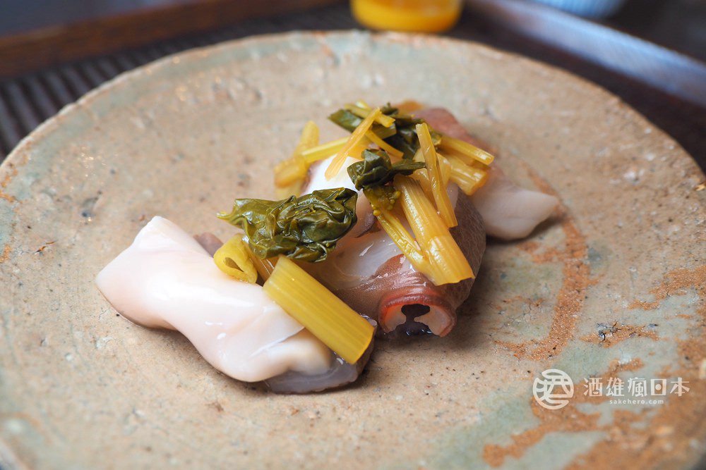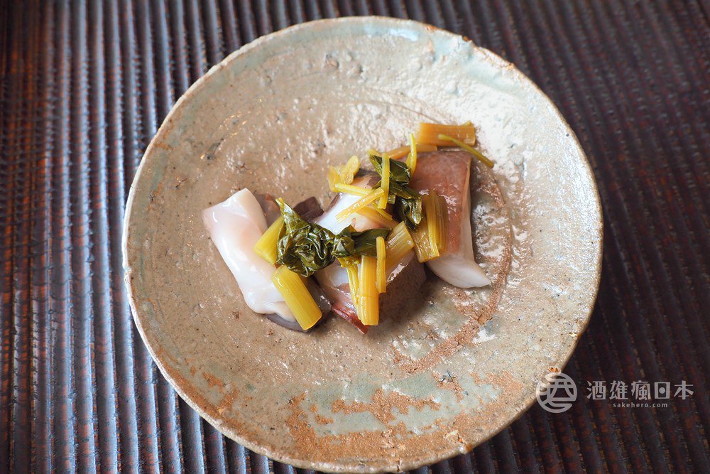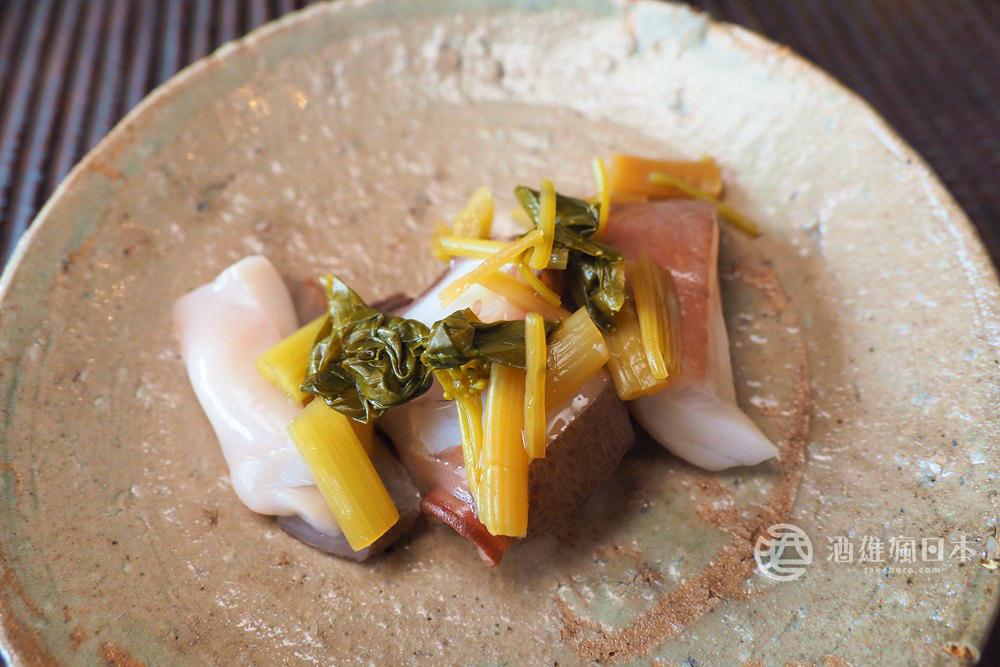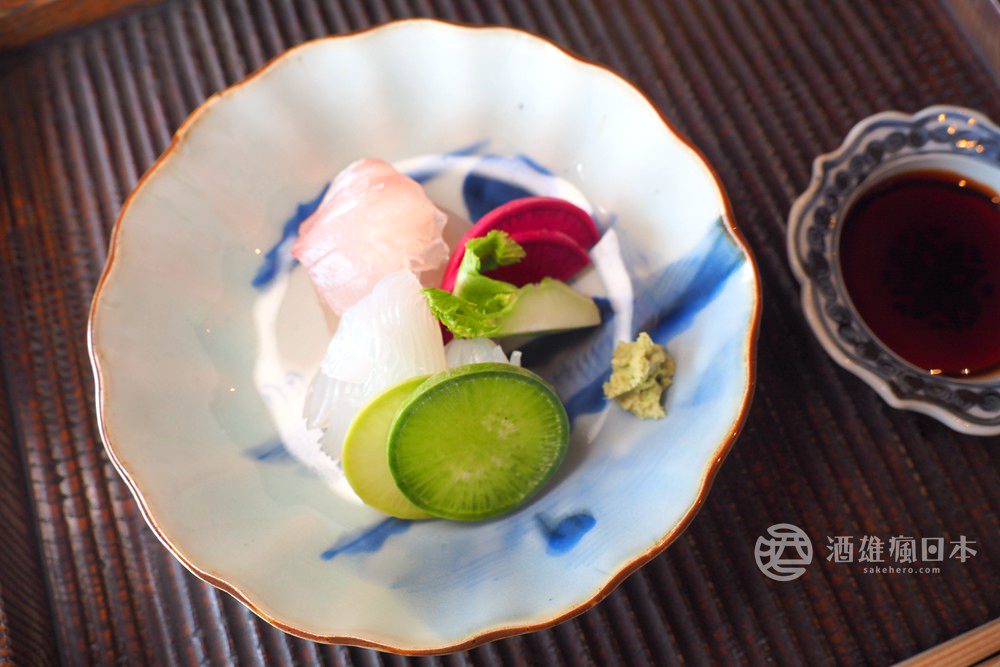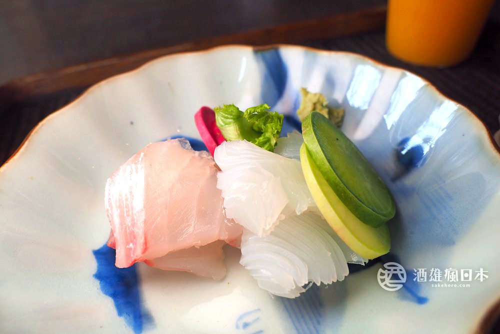 有鯛魚跟烏賊兩種生魚片,搭配較不鹹的高湯醬油使用。兩種生魚片都非常甜美,讓一行人非常的驚豔,有人說從沒吃過這麼好吃的烏賊,也有人說每想到生魚片可以這麼Q彈好吃。
