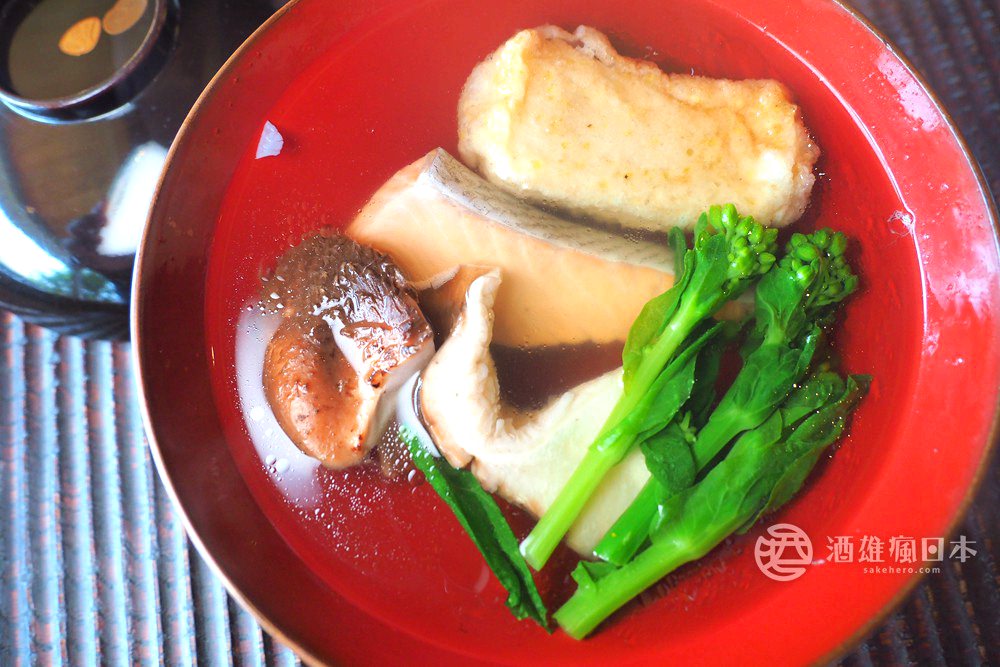 第三道是用油菜花、櫻鱒、香菇等做成的吸物(清湯)。