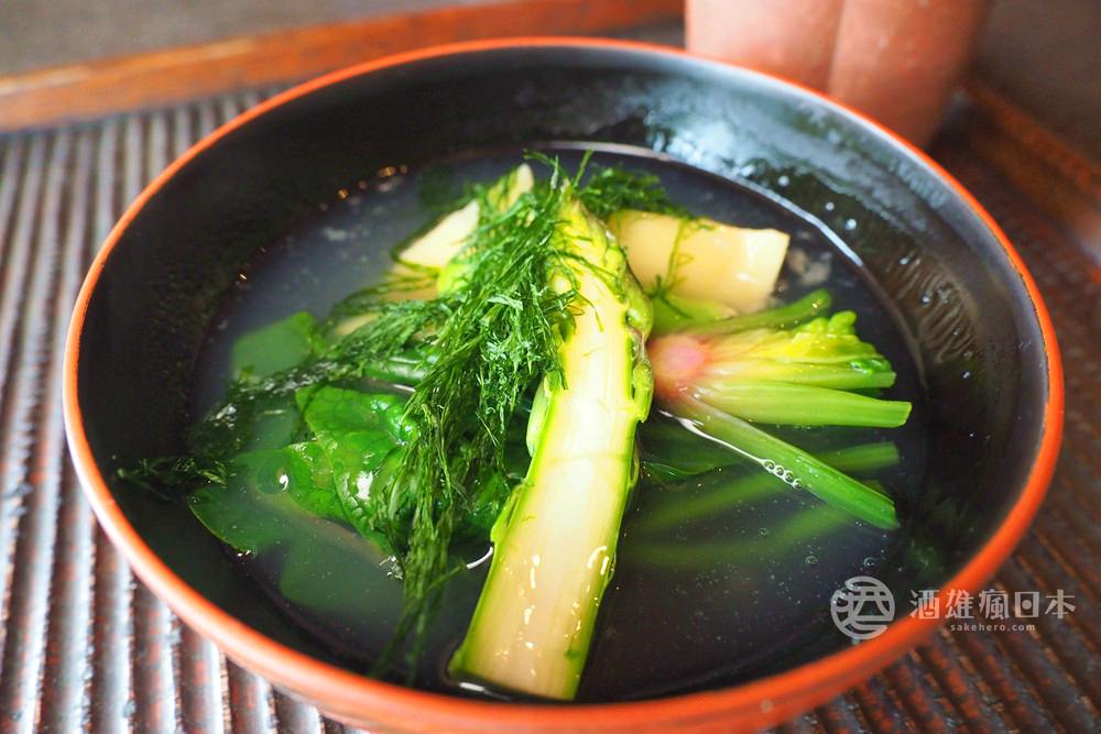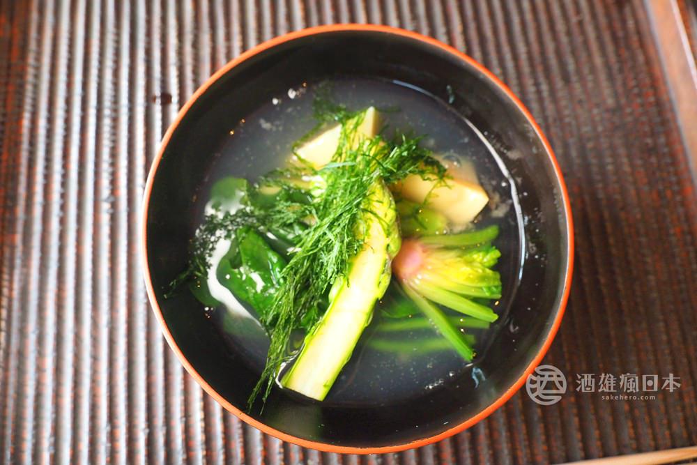 第六道是季山菜的椀物,除了筍子跟蘆筍以外,我真的不知道這些山菜的中文怎麼說。搭配勾芡的柴魚高湯,吃下去非常暖身又暖心。其實我吃到這邊已經很飽了,但其實日式套餐都一樣,沒看到白飯都沒到尾聲。